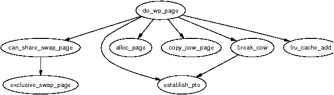 Fork를 하는 동안, 두 프로세스의 PTE들을 read-only로 설정하여 write가 발생하면 page fault가 발생하도록 한다. Linux는 COW page를 인지할 수 있는데, 이는 PTE가 write protect되더라도, 해당하는 VMA는 여전히 writable로 표시되기 때문이다. COW은 do_wp_page()를 통해 수행되며, 이는 페이지의 복사본을 만들고 쓰기를 수행한 프로세스에 매핑한다. 필요한 경우, 새로운 swap slot이 페이지에게 예약될 것이다. 이 방법을 통해, fork 과정에서는 오로지 페이지 테이블 엔트리만이 복사된다.