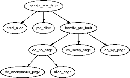 예외 처리자가 어떠한 폴트가 valid memory region에서의 valid page에 대한 폴트임을 알았다면, 해당 폴트는 아키텍처 독립적인 함수인 handle_mm_fault()가 이어서 처리하게된다 (Call graph는 Figure 4.14에서 확인할 수 있다). 이 함수는 만약 필요한 페이지 테이블 엔트리가 없다면 이를 할당하고 handle_pte_fault()를 호출한다.
