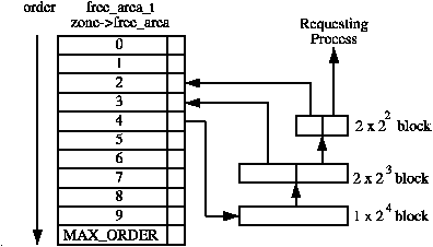 그러므로, 배열의 0번째 요소는 2^0, 즉 1개의 페이지로 구성된 free 페이지 블록의 리스트를 가리킬 것이며, 1번째는 2^1(=2)개의 페이지를, MAX_ORDER-1 번째는 2^(MAX_ORDER-1)개의 페이지들의 리스트를 가리킬 것이다 (MAX_ORDER는 현재에는 10으로 정의되어있다). 이는 작은 블록이 충분함에도 큰 블록을 쪼개는 상황이 발생할 확률을 제거한다. 페이지 블록들은 page->list를 통해 linear linked list로 관리된다