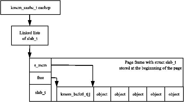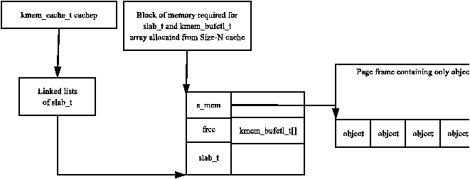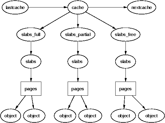 각 캐시는 slabs라고 불리는 연속된 페이지 블록을 관리하며, 이는 캐시가 관리하는 자료구조 또는 객체를 위한 작은 청크들로 유지된다. 구조체간의 관계도가 Figure 8.1에 나와있다.